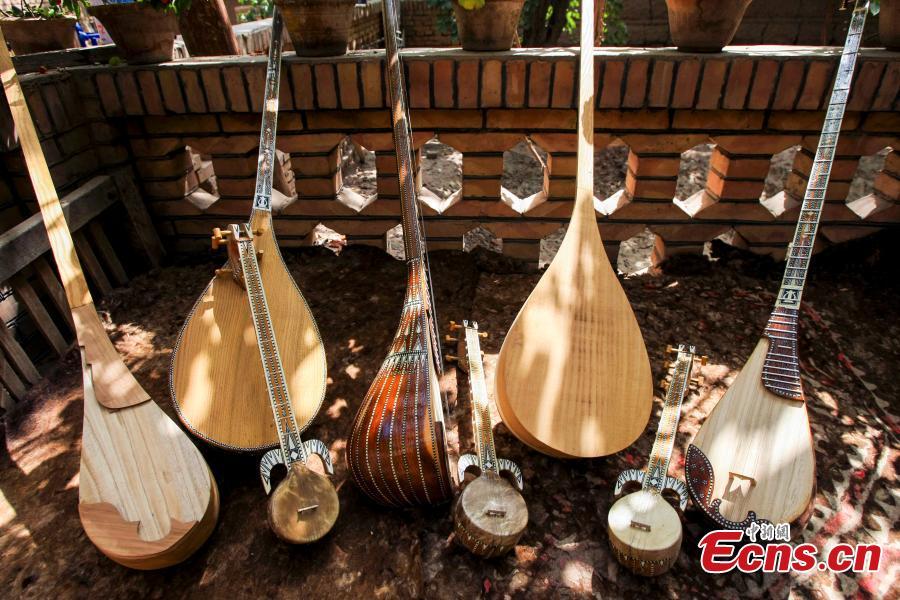 Musical instruments made by Rahman Abduh in his home at Tuwankewukushake village in Shufu county, Northwest China's Xinjiang Uyghur autonomous region. [Photo/China News Service]