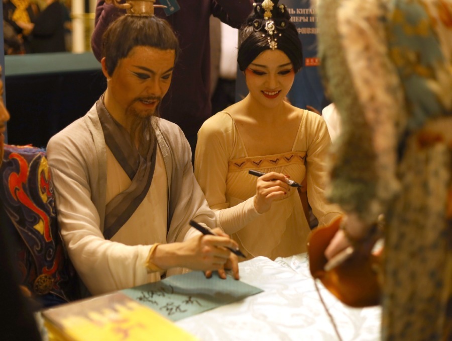 Performers of the dance drama "Confucius" sign for fans at the backstage of Mariinsky Theatre in St. Petersburg, Russia, Dec 3, 2019. The dance drama "Confucius", performed by the China National Opera and Dance Drama Theatre, was staged on Tuesday at Mariinsky Theatre.[Photo/Xinhua] |