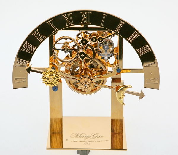 The solar-lunar skeletonized clock, which won Guo Ming a place as a candidate at the prestigious Swiss independent watch and clockmaking association, the Academie Horlogere des Createurs Independants.[Photo provided to China Daily]
