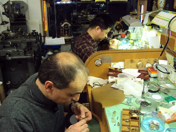 Guo studies watchmaking under the guidance of Jutzi (left) in the same year.[Photo provided to China Daily] |