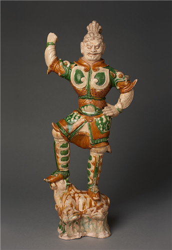Earthenware Lokhapala on a recumbent bull from Tang Dynasty (618-906). [Photo provided to China Daily] |