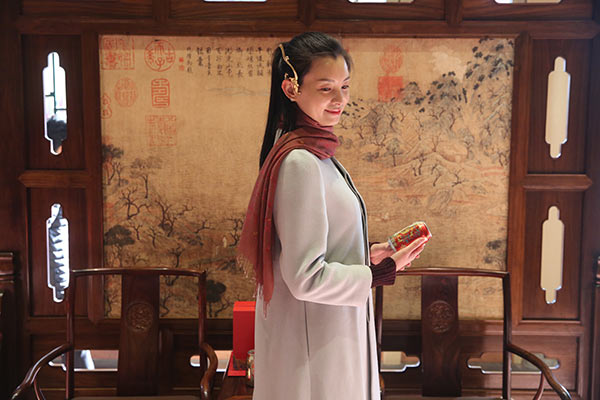 A model poses with a can of Jianlibao featuring auspicious patterns from Qing Dynasty (1644-1911) emperor's robes. [Photo by Jiang Dong/China Daily]