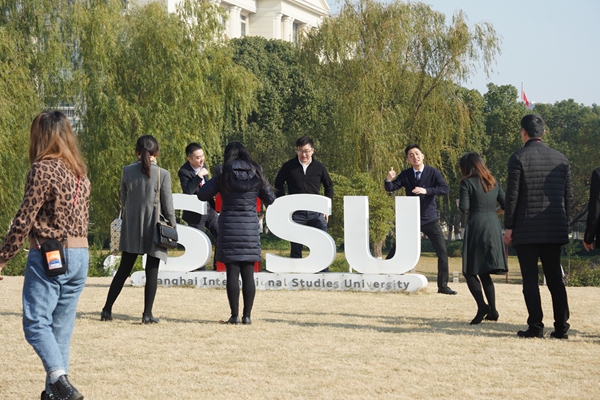 Students and visitors gather at the logo sculpture of the Shanghai International Studies University.[Photo by Gao Erqiang/China Daily] |