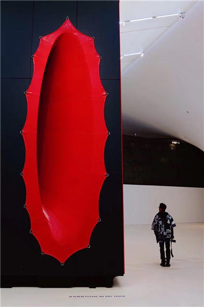 A viewer stands beside one of Anish Kapoor's artworks on display at the CAFA Art Museum in Beijing. [Photo provided to chinadaily.com.cn] |