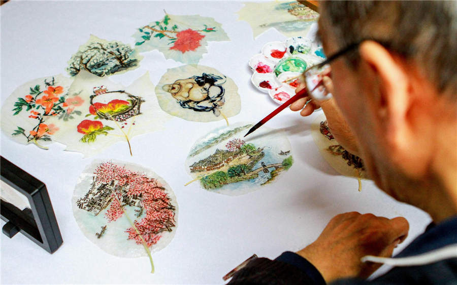 Zhu Yuyao makes leaf vein picture at home in Handan, North China's Hebei province, Dec 11, 2019. Leaf vein picture is an intangible cultural heritage in Handan city. [Photo/Xinhua]