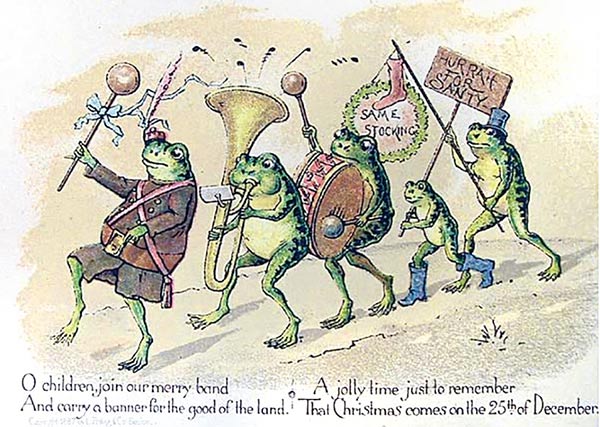Christmas card by Louis Prang showing a group of anthropomorphised frogs parading with banner and band. [Photo provided to China Daily] |