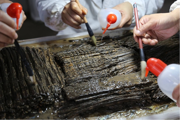 Archaeologists clean bamboo slips excavated from the tomb of the Marquis Haihun in Nanchang, Jiangxi province.[Photo provided to China Daily] |