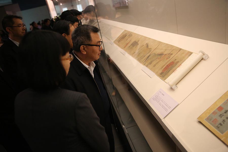 Wang Chunfa, director of National Museum of China, looks at a painting by Yuan artist Ren Renfa on show. [Photo provided to China Daily]