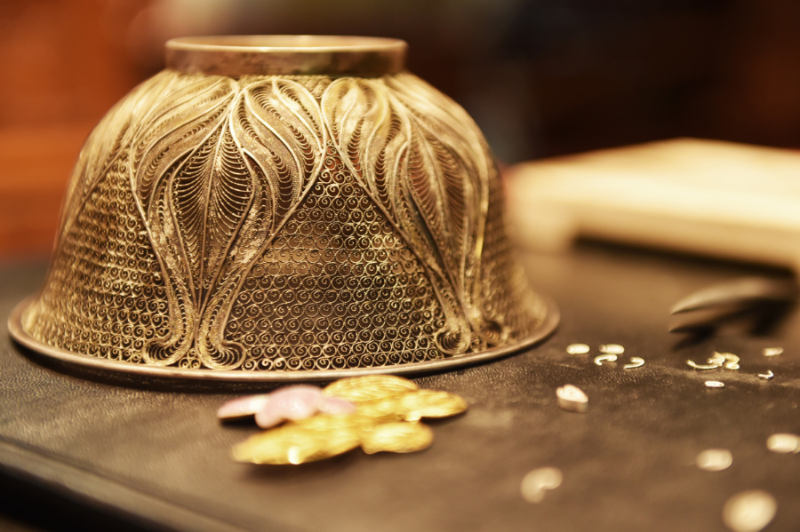 Photo taken on Dec 17, 2019 shows a silver bowl made with filigree inlay techniques in Beijing, capital of China. Filigree inlay is crowned as one of the eight traditional arts and crafts of Beijing. With gold or silver as raw material, filigree inlay craftsmen apply complex techniques such as knitting and welding so as to shape metal wires into various forms. Then they create fluted patterns on the wires with techniques such as hollowing and cutting for gems to be inserted. Once a royal technique, filigree inlay is listed as one of the national intangible culture heritage. Dong Ruijing has been working on filigree inlay for over 30 years. His artwork have been recognized and rewarded in various competitions and expo committees. In recent years, Dong has been promoting and innovating this technique so that it can be known and favored by more people and the traditional culture be passed down.[Photo/Xinhua]