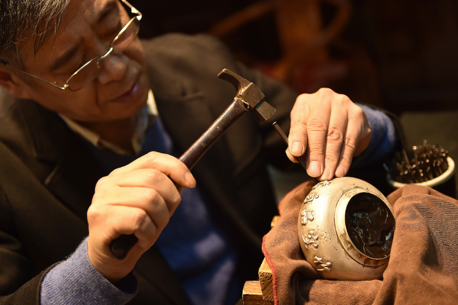 Dong Ruijing engraves Chinese characters on a piece of filigree inlay silver artwork in Beijing, capital of China, Dec 17, 2019.Filigree inlay is crowned as one of the eight traditional arts and crafts of Beijing. With gold or silver as raw material, filigree inlay craftsmen apply complex techniques such as knitting and welding so as to shape metal wires into various forms. Then they create fluted patterns on the wires with techniques such as hollowing and cutting for gems to be inserted. Once a royal technique, filigree inlay is listed as one of the national intangible culture heritage. Dong Ruijing has been working on filigree inlay for over 30 years. His artwork have been recognized and rewarded in various competitions and expo committees. In recent years, Dong has been promoting and innovating this technique so that it can be known and favored by more people and the traditional culture be passed down.[Photo/Xinhua]