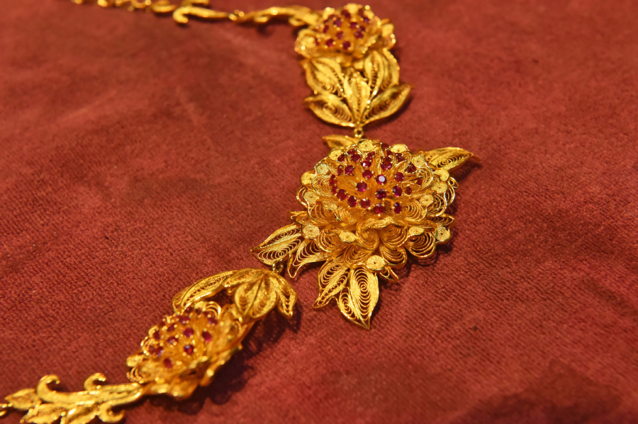 Photo taken on Dec 17, 2019 shows a filigree inlay necklace in Beijing, capital of China. Filigree inlay is crowned as one of the eight traditional arts and crafts of Beijing. With gold or silver as raw material, filigree inlay craftsmen apply complex techniques such as knitting and welding so as to shape metal wires into various forms. Then they create fluted patterns on the wires with techniques such as hollowing and cutting for gems to be inserted. Once a royal technique, filigree inlay is listed as one of the national intangible culture heritage. Dong Ruijing has been working on filigree inlay for over 30 years. His artwork have been recognized and rewarded in various competitions and expo committees. In recent years, Dong has been promoting and innovating this technique so that it can be known and favored by more people and the traditional culture be passed down.[Photo/Xinhua]