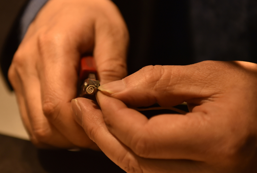 Dong Ruijing works on a piece of filigree inlay artwork in Beijing, capital of China, Dec 17, 2019. Filigree inlay is crowned as one of the eight traditional arts and crafts of Beijing. With gold or silver as raw material, filigree inlay craftsmen apply complex techniques such as knitting and welding so as to shape metal wires into various forms. Then they create fluted patterns on the wires with techniques such as hollowing and cutting for gems to be inserted. Once a royal technique, filigree inlay is listed as one of the national intangible culture heritage. Dong Ruijing has been working on filigree inlay for over 30 years. His artwork have been recognized and rewarded in various competitions and expo committees. In recent years, Dong has been promoting and innovating this technique so that it can be known and favored by more people and the traditional culture be passed down.[Photo/Xinhua]