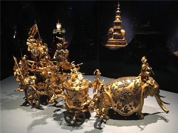 A gold and silver ware at the updated antique clock gallery of the Palace Museum in Beijing. [Photo by Wang Kaihao/chinadaily.com.cn] |