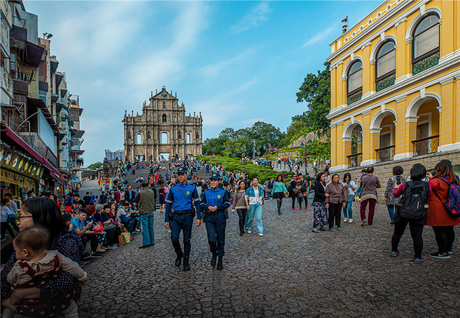 Police patrol at the tourist attraction Ruins of St. Paul's in Macao. [Photo by Deng Pufeng/provided to chinadaily.com.cn]