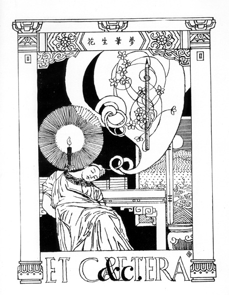 In one of his Beardsley-style illustrations, he drew a maiden dreaming of blossoms growing out of a pencil-mirroring an ancient Chinese fable-as she sleeps at a desk by candle light.
