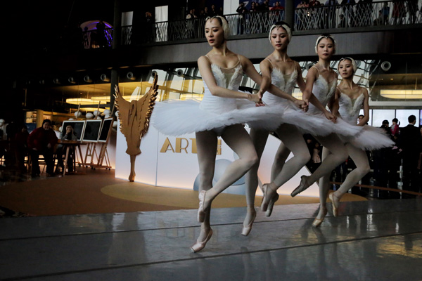 Ballerinas dance Swan Lake in the NCPA's public space as one of the 50 programs to celebrate the occasion on Sunday. [Photo by JIANG DONG/CHINA DAILY] |