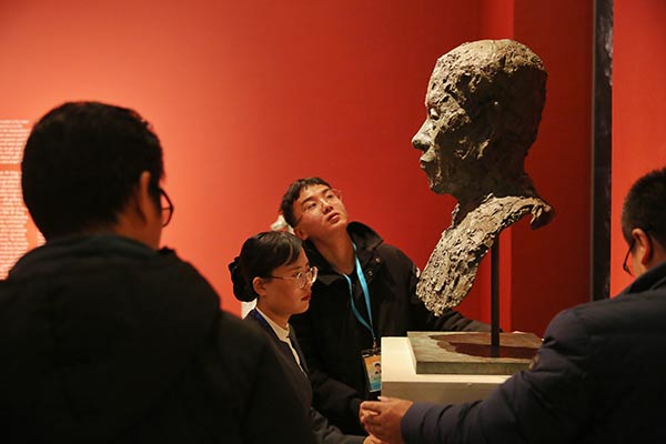 Visitors view a sculpture by late Chinese-French artist Hsiung Ping-ming at an exhibition at the National Art Museum of China. [Photo by Jiang Dong/China Daily]