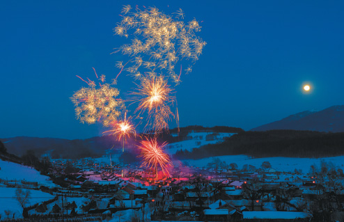 Fireworks lighten up sky above Erhe village in Jilin province. [Photo provided to China Daily] |