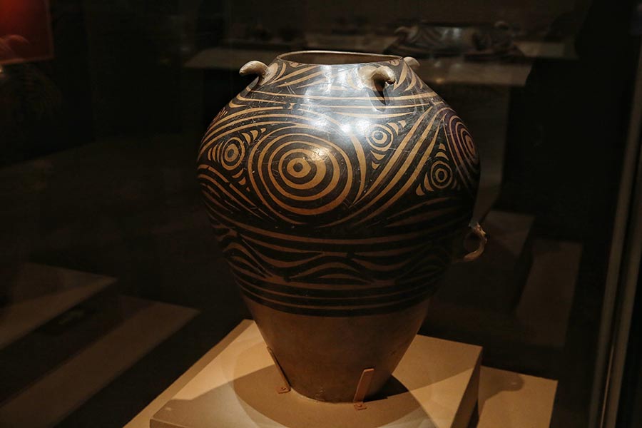 Neolithic and bronze-age pottery painted with a variety of primitive and creative patterns are on show at  Heavenly Beauty, Emerging Rays, an exhibition on now at the National Museum of China through Jan 3. [Photo by Jiang Dong/China Daily]