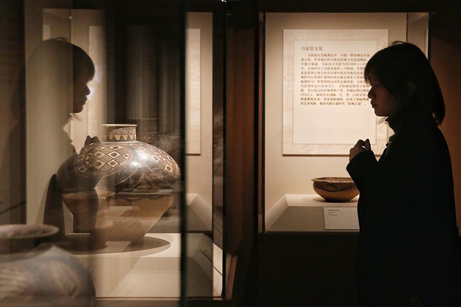 Neolithic and bronze-age pottery painted with a variety of primitive and creative patterns are on show at  Heavenly Beauty, Emerging Rays, an exhibition on now at the National Museum of China through Jan 3. [Photo by Jiang Dong/China Daily]