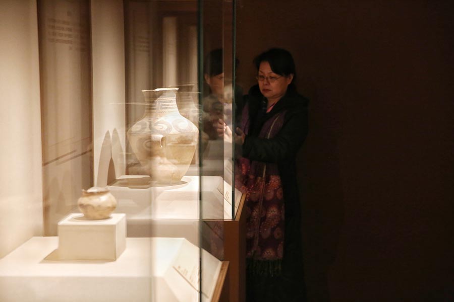 Neolithic and bronze-age pottery painted with a variety of primitive and creative patterns are on show at  Heavenly Beauty, Emerging Rays, an exhibition on now at the National Museum of China through Jan 3. [Photo by Jiang Dong/China Daily]