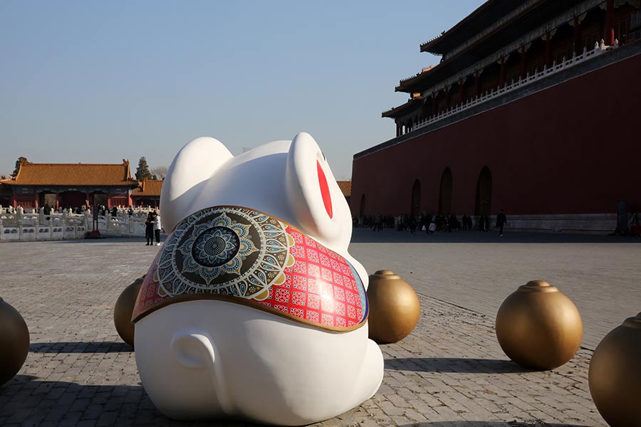 A rat figurine was revealed to welcome the upcoming Year of the Rat at the Taihe Gate of the Forbidden City in Beijing on Dec 27. The rat is often regarded as a symbol of fortune and prosperity in China. [Photo by Jiang Dong/China Daily]