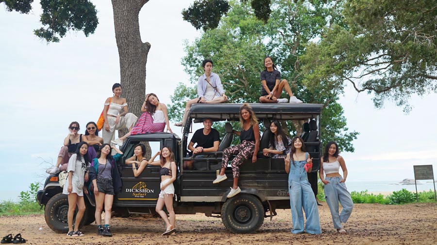 Guo Shujuan (first right on top of the car), 33, China's top-class female surfer, helps her trainees immerse themselves in local surfing culture in Sri Lanka. [Photo provided to China Daily] |