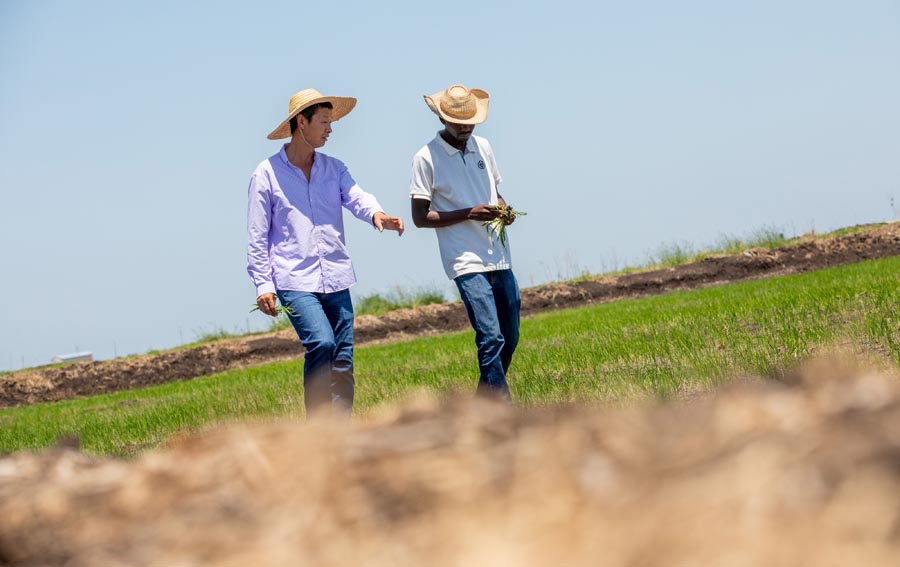 A Chinese agricultural expert (left) and a local agricultural technician inspect the rice fields. [Photo/Xinhua]