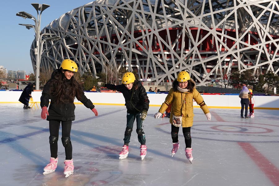 Tourists skate outside the Bird's Nest in Beijing, Dec 26, 2019. [Photo/Xinhua] |