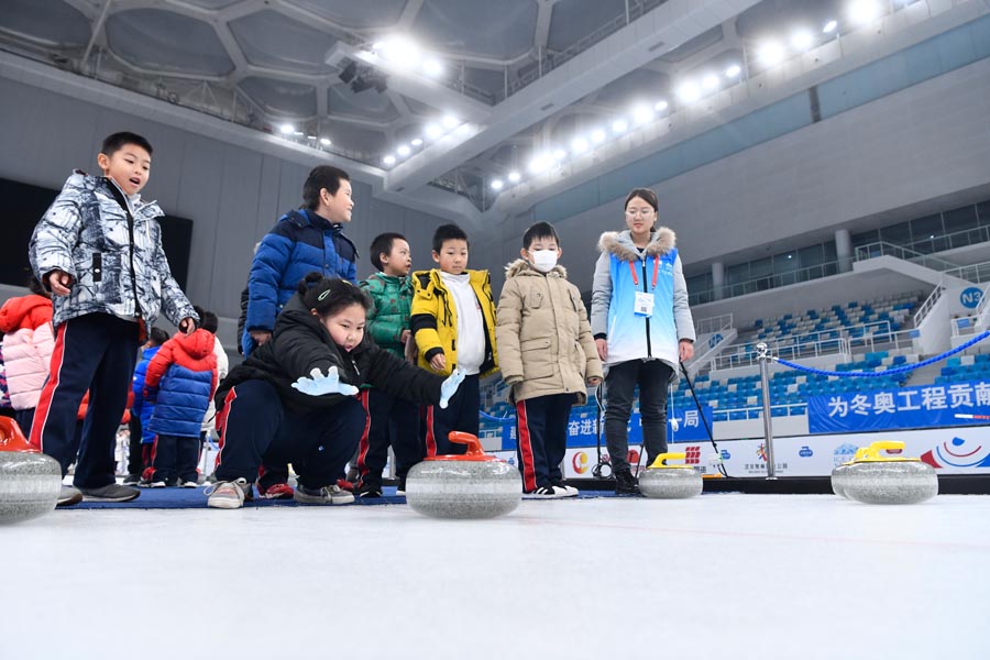 Children experience curling at the Water Cube in Beijing, Dec 26, 2019. [Photo provided to chinadaily.com.cn]