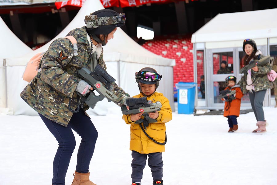 A mother guides her child as they try out war games during the opening of the Ice & Snow Cultural Festival, Dec 26, 2019. [Photo provided to chinadaily.com.cn]