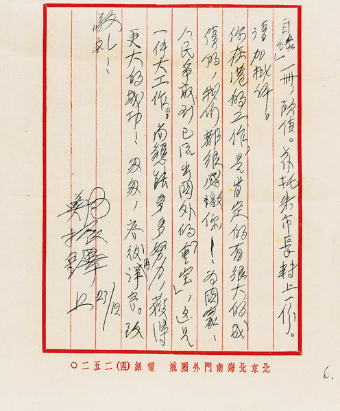 A letter by Zheng Zhenduo to Hong Kong banker Xu Bojiao in the early 1950s is on show at the National Library of China. [Photo provided to China Daily] |