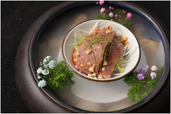 The Wagyu beef is tender, rich in fat, highly nutritious and renowned for its premium quality and taste. The pebbles are heated in the oven at 250 °C before placing the beef on them. Then, brandy and black pepper are added before flipping the meat on the sizzling pebbles until cooked. The brandy and black pepper blends with the meat to elicit the full intensity of the Wagyu beef’s flavors.