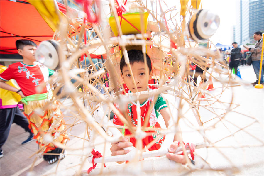 A young actor shows how to perform lion dance during the Macao International Dragon and Lion Dance Day event at Praca da Amizade (Friendship Square) in Macao, South China, Jan 1, 2020. [Photo/Xinhua]