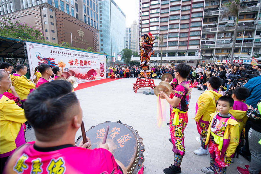 Actors perform a lion dance during the Macao International Dragon and Lion Dance Day event at Praca da Amizade (Friendship Square) in Macao, South China, Jan 1, 2020. [Photo/Xinhua]
