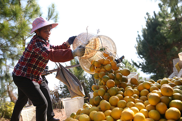 Farmers transfer freshly picked orange pomelos.[Photo by Chen Zebing/China Daily] |