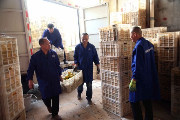 Li Fashun (left) and his colleagues move the navel oranges into the warehouse.[Photo by Chen Zebing/China Daily]