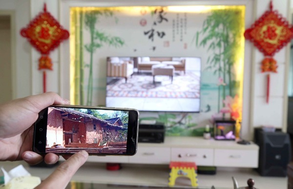 Li shows in his phone the old adobe house where he used to live.[Photo by Chen Zebing/China Daily]