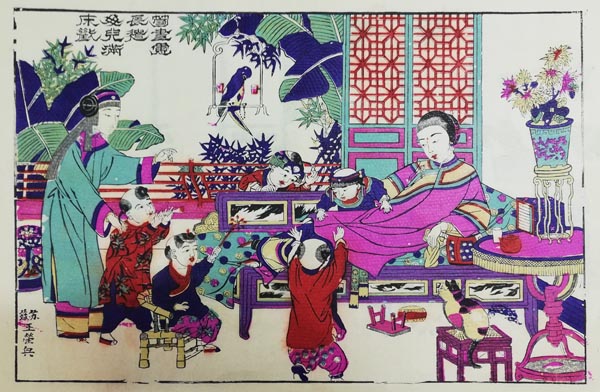 A Qing Dynasty Lunar New Year print features a mother with her kids, a production of Taohuawu in Suzhou, Jiangsu province. [Photo provided to China Daily] |