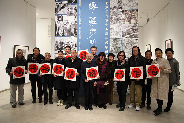 Li Xiaoke (center) with his students at the exhibition opening. [Photo provided to China Daily]