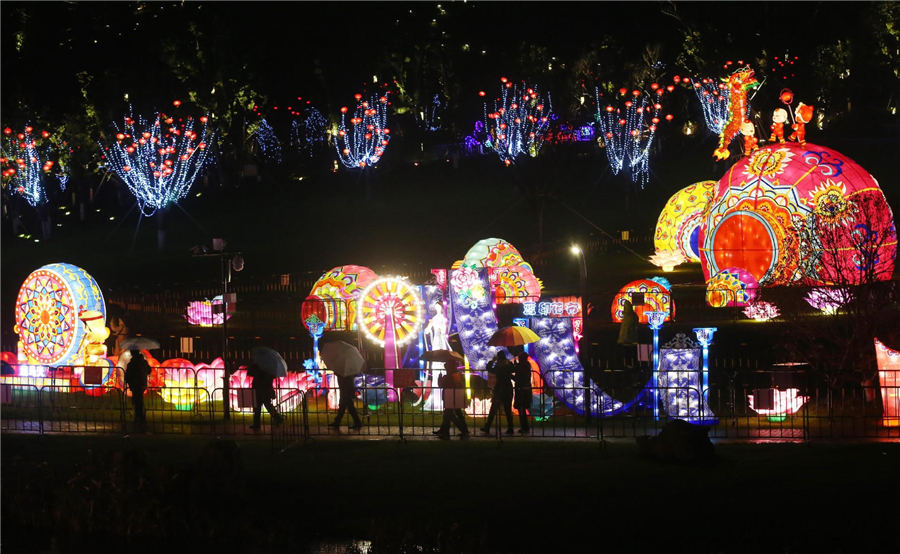 Visitors view illumination installations during a lantern show in Nantong city, East China's Jiangsu province, Jan 15, 2020. Over 130 illumination installations were exhibited on the show. [Photo/Xinhua]