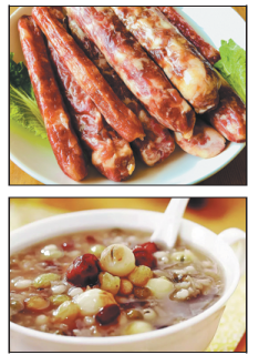 Handmade sausages (top) and the laba porridge (above) are among the delicacies made or eaten in the last month of the lunar calendar.[Photo by Lin Qi/China Daily] |