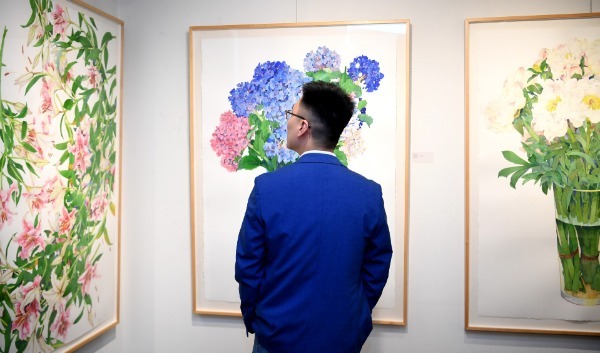 A visitor views artworks at a recent exhibition as part of a 2020"Happy Chinese New Year" program in San Francisco.[Photo/Xinhua] |