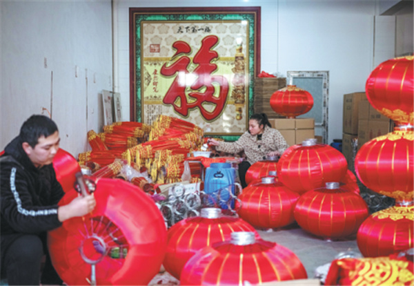 Zhang Xiaoxuan and his wife Su Yalan make palace lanterns in their factory on Dec 5, 2019. [Photo by Zhou Guangfeng/For China Daily]