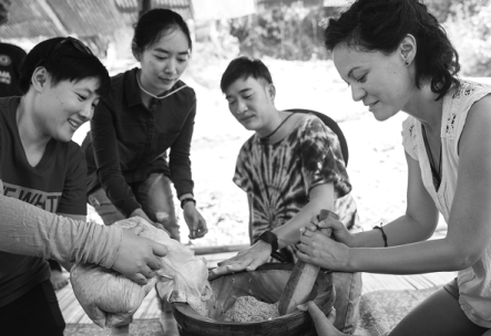 Visitors prepare food, a mixture of local herbs and salt, for the elephants at ChangChill, under the guidance of a tour guide.[Photo provided to China Daily] |
