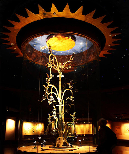 A visitor takes a close look at a bronze sculpture at Sanxingdui Museum in Guanghang, Sichuan province on Oct 1, 2017. [Photo/Official Website of Sanxingdui Museum] |