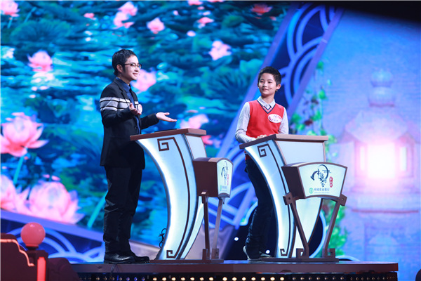 Peng (left), an associate senior editor of a poetry magazine, competes onstage with Han Yaxuan in the final of the recent China Central Television's Chinese Poetry Conference. [Photo provided to China Daily]