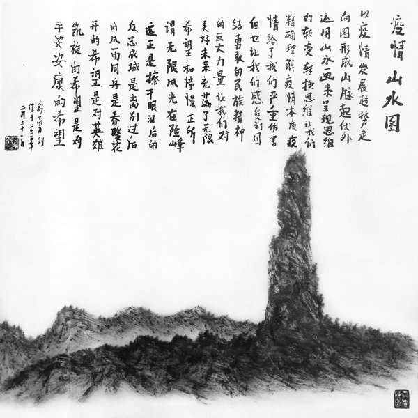 Shu says the paintings show his development of understanding the epidemic situation. "Although this epidemic has had a disastrous influence, it enables us to realize the power of solidarity, courage, diligence in our country and look forward to a better future. Infinite beauty can only be seen at the perilous peak."