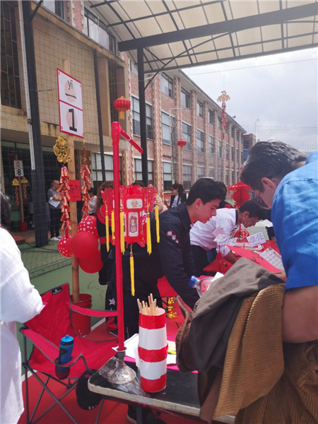 Students of the Montessori School of Colombia in Bogota and their parents try their hands at writing spring couplets at the 2020 Chinese New Year celebrations on Feb 22, 2020. [Photo provided to Chinaculture.org]