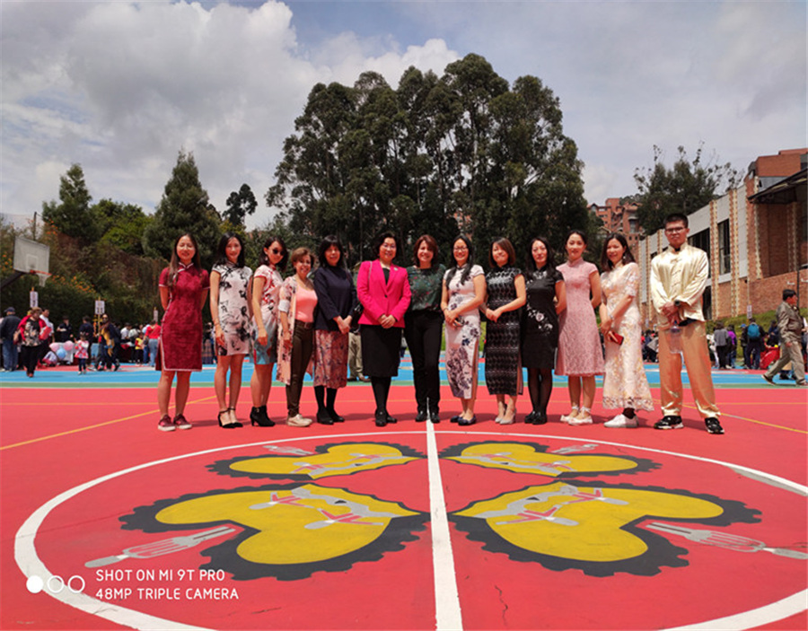 Zhu Xiaoyan (fifth from left), cultural counsellor of the Chinese embassy in Colombia, poses for a group photo with Chinese teachers of the Confucius classroom at the Montessori School of Colombia in Bogota at the 2020 Chinese New Year celebrations on Feb 22, 2020. [Photo provided to Chinaculture.org] |